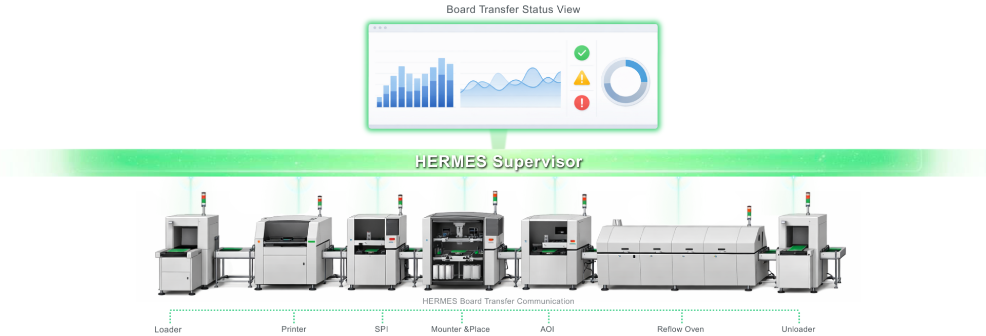 透過 HERMES 協議進行板卡傳遞,實現 SMT 設備間即時數據交換與自動化連線