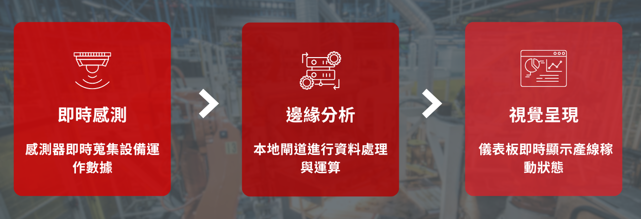 透過本地邊緣運算模組即時處理資料,生成稼動率統計與異常紀錄