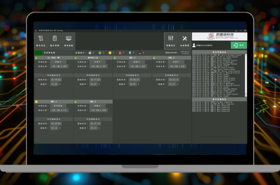 集中監控多台機台運轉、停機與警示狀態, 透過即時數據更新與歷史記錄查詢, 提升生產透明度與管理精準度
